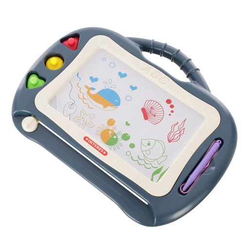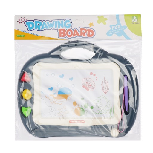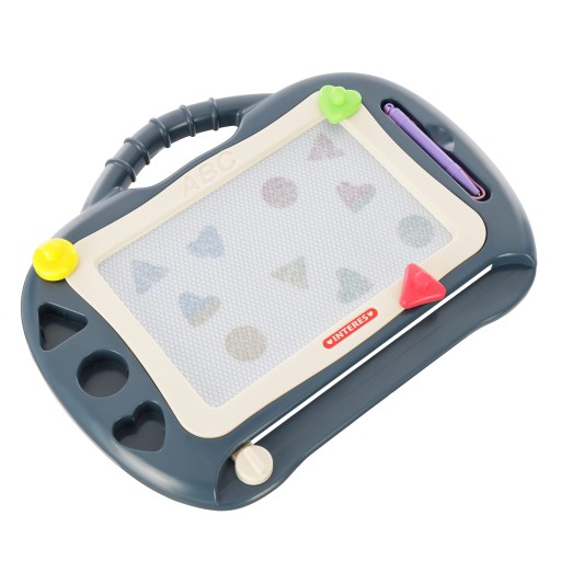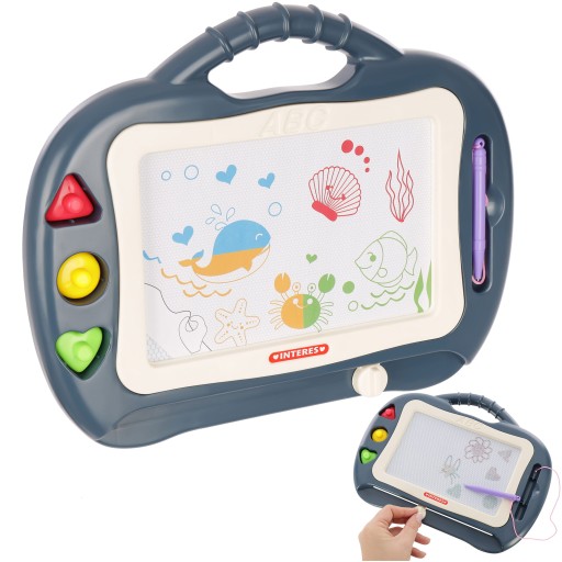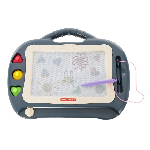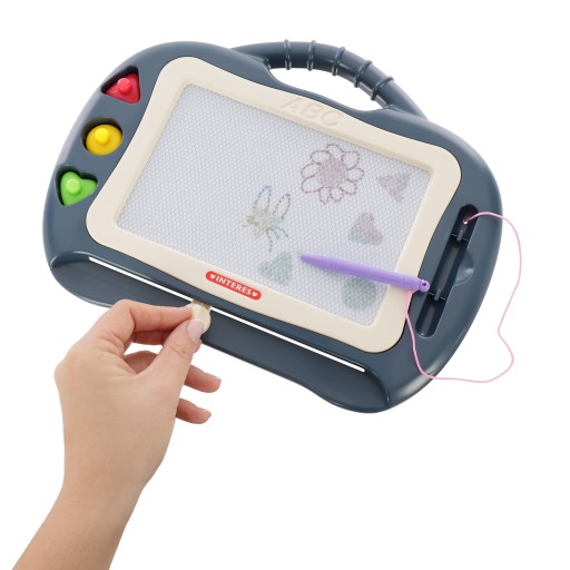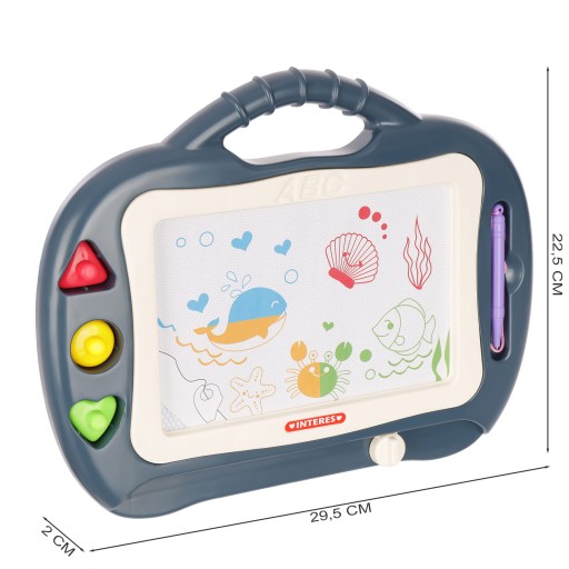 W zestawie znajduje się specjalny długopis. Wszystkie rysunki namalowane z jego pomocą można wymazać w ciągu kilku sekund. Dodatkowo tablica wyposażona została w trzy foremki o różnych kształtach: trójkąt, koło i serduszko, maluch może odbijać je na tablicy.
