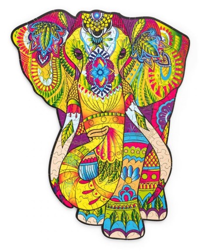 Piękne drewniane puzzle z motywem słonia to oryginalny pomysł na prezent. Te puzzle wyróżniają się wśród innych nie tylko wzornictwem i kolorystyką. To co zasługuje na uwagę to fakt, że wśród 193 elementów, z których są złożone niektóre mają kształty innych ciekawych zwierząt. Puzzle jakie składają się na całość obrazu mają kształt m.in.: palmy, bawoła, lwa, kameleona, węża i wielu innych. Co jeszcze istotne każdy element ma inny kształt i kolorystykę. Będziecie potrafili je dopasować ?