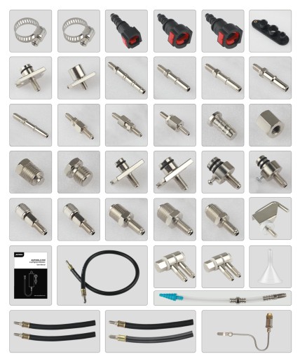 Zestawy do czyszczenia wtryskiwaczy zawierają wiele różnych rodzajów adapterów, Obejmują prawie wszystkie samochody ue, azji, USA i lekkich ciężarówek. Bez demontażu przepustnicy wtryskiwacza i układu paliwowego. system jest nie tylko charakterystyczny dla wysokie i niskie ciśnienie funkcji czyszczenia. W tym samym czasie umieścić funkcję całego układu paliwowego komory spalania kilku głównych funkcji w jednym produkcie, takich jak zawór dławiący czyszczenia i dysza paliwowa.