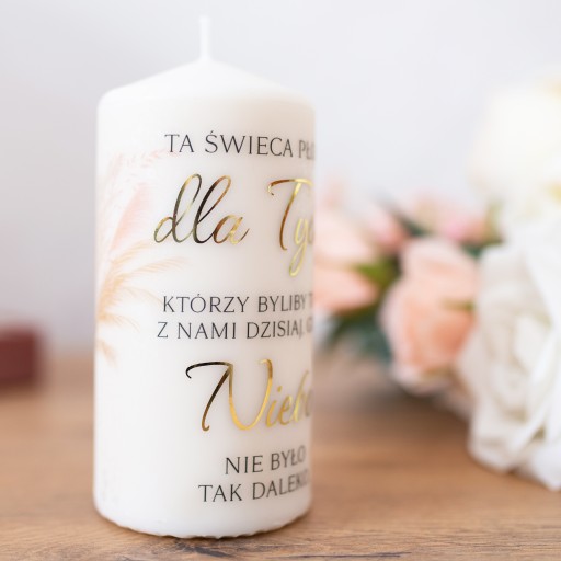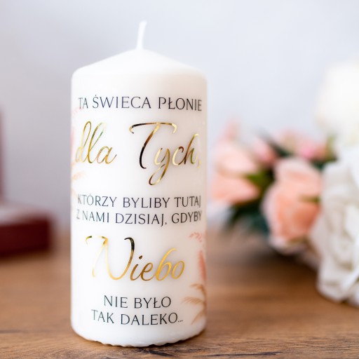 Sam nadruk wykonany jest w 2 technikach, tradycyjny + nadruk ze złoceniem. Ta świeca z pewnością będzie stanowiła również element dekoracyjny wesela, a co najważniejsze Wasi goście ją zauważą przez co będą wspólnie z Wami wspominać osoby tak ważne, a nie obecne.