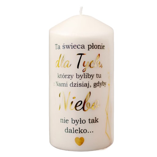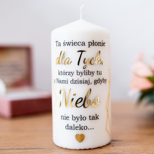 Sam nadruk wykonany jest w 2 technikach, tradycyjny + nadruk ze złoceniem. Ta świeca z pewnością będzie stanowiła również element dekoracyjny wesela, a co najważniejsze Wasi goście ją zauważą przez co będą wspólnie z Wami wspominać osoby tak ważne, a nie obecne.