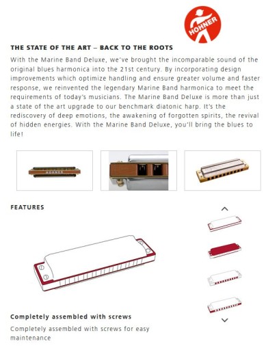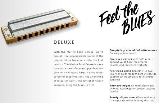 Z harmonijką Marine Band Deluxe firma Hohner przeniosła niepowtarzalne brzmienie oryginalnej harmonijki bluesowej do 21 wieku. Dzięki zaaplikowaniu ulepszeń w budowie które zapewniają wygodniejsze trzymanie oraz większą głośność i szybszą reakcję instrumentu, stworzono harmonijkę która posiada najlepsze cechy oryginalnego Marine Band, ale spełnia wszystkie wymagania dzisiejszych muzyków. Marine Band Deluxe to zdolność stworzenia głębokich emocji, odkrywania zapomnianych legend i obudzenia ukrytych energii. Z harmonijką Marine Band Deluxe możesz zadać bluesowi nowego życia w 21 wieku.