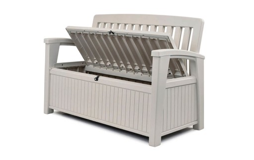 2 w 1! Ławka połączona z pojemnym schowkiem. Skrzynia PATIO BENCH to pomysłowe rozwiązanie dla tych, którzy chcą zorganizować swój balkon lub ogród w sposób elegancki, ale też praktyczny. Dzięki dużej pojemności, w skrzyni zmieści się koc i poduszki, a nawet sprzęt rekreacyjny. Ponadto, faktura powierzchni, przypominająca naturalne drewno doskonale podkreśli urok aranżowanej przestrzeni. Ławka przeznaczona jest do samodzielnego, prostego montażu.
