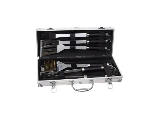 Na zestaw składa się aż pięć sztućców. Poręczne szczypce, widelec i łopatka dzięki którym z łatwością przerzucisz mięso. Specjalny pędzel, którym możesz natrzeć mięso marynatą bez brudzenia rąk. Utrzymanie czystości grilla umożliwia przeznaczona do tego szczotka. Wszystkie akcesoria zostały wykonane z wysokojakościowej stali nierdzewnej, która nie wpływa na smak i zapach jedzenia. Wysokojakościowe tworzywo jest niesamowicie trwałe, co przekłada się na modele, które na długo zachowają swój wygląd i jakość. Przybory z łatwością możesz przechowywać w dołączonej walizce o wymiarach 37 x 14 x 7 centymetrów. Aluminiowy materiał jest niesamowicie lekki, co jest dodatkowym atutem podczas transportu. Mocne zapięcie nie odpina się samoistnie, schowane rzeczy są bezpieczne i nie wypadają. To niezawodny model, który docenisz podczas grillowania.