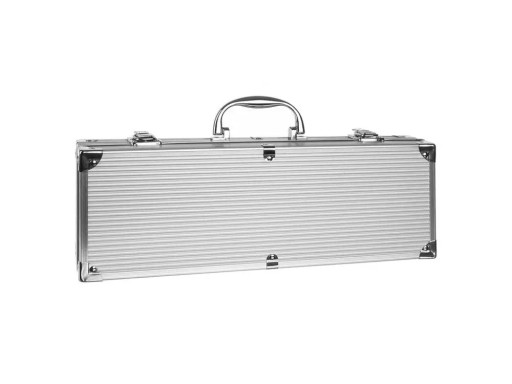 - MOCNA ALUMINIOWA WALIZKA – zestaw grillowy zapakowany jest w bardzo wytrzymałą walizkę, wykonaną z aluminium. Posiada ergonomiczną rączkę, która umożliwia wygodne przenoszenie i transport. Bez problemu możemy zabrać ją do znajomych lub na wyjazd.
