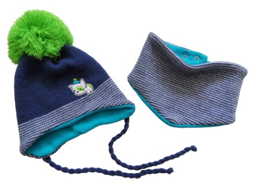 ZIMOWY CIEPŁY ZESTAW CHŁOPIĘCY - CIEMNA NIEBIESKA WIĄZANA CZAPECZKA W BIAŁE WZORKI Z ZIELONYM POMPONEM I NIEBIESKI - BIAŁY SZALICZEK - CHUSTA ZAPINANA NA ZATRZASKI