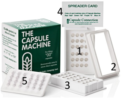 Podręczna kapsułkarka, umożliwiająca samodzielne pakowanie kapsułek żelatynowych i celulozowych. Jednorazowo można napełnić 24 kapsułki, co zajmuje około 5-10 minut.