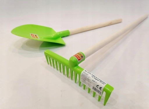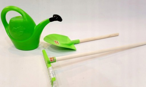 SKŁAD ZESTAWU: TACZKI DZIECIĘCE (z elementami metalowymi) + NARZĘDZIA (grabki zwykłe oraz łopata)+konewka