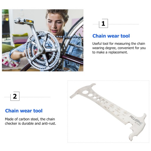 Zużyty łańcuch przesuwa się słabo i zużywa zębatki w przyspieszonym tempie. Użyj sprawdzania łańcucha, aby zmierzyć stopień zużycia łańcucha, wygodny do wymiany. Wykonany ze stali węglowej kontroler łańcucha jest trwały i antykorozyjny. Kompatybilny ze wszystkimi łańcuchami.