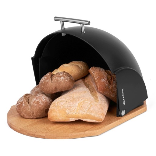 Pozostałe informacje: - uchylny mechanizm otwierania- nóżki antypoślizgowe, - 2w1 chlebak z funkcją deski do krojenia, - wykończenie wewnętrzne: mat, - wykończenie zewnętrzne: mat, - kształt: owalny, - stalowy, nitowany uchwyt w kolorze srebrnym