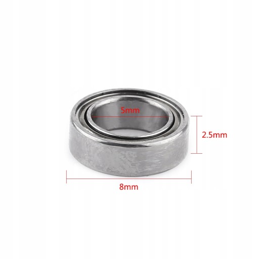 - Łożyska mają średnicę wewnętrzną 5 mm, średnicę zewnętrzną 8 mm i grubość 2,5 mm.