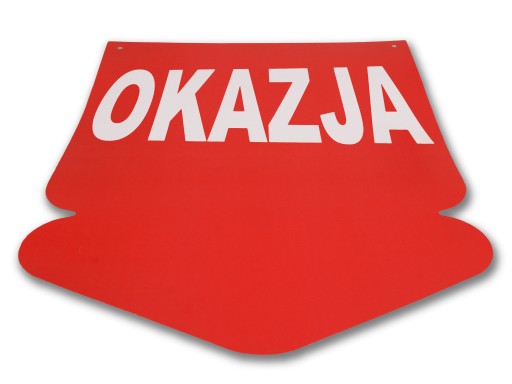 Strzałka kartonowe w kolorze czerwonym z dużym, białym napisem "OKAZJA" przeznaczona jest do oznaczania towaru wyprzedażowego. Wykonana jest ze śliskiego papieru.