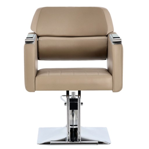 Fotel charakteryzuje się eleganckim i ergonomicznym designem, który pozwala na wygodną pracę fryzjera oraz relaks klientów.