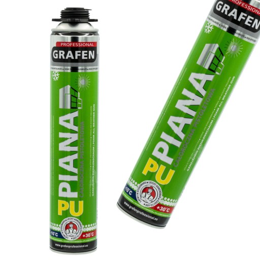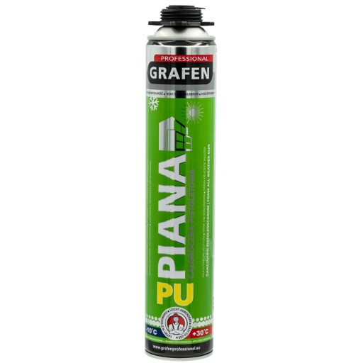 Piana całoroczna pistoletowa Grafen - Uniwersalna całoroczna piana pistoletowa jest produktem cechującym się doskonałą odpornością na czynniki zewnętrzne. Może być używana na różnych rodzajach materiałów budowlanych, co świadczy o jej wszechstronnym zastosowaniu. Ten całoroczny preparat zachowuje specyficzne właściwości niezależnie od warunków atmosferycznych.