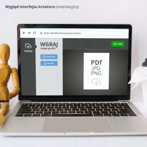 Kreator akceptuje popularne formaty plików: pdf, jpg, png. Przed drukiem sprawdzimy Twój projekt i naniesiemy niezbędne korekty, bez ingerencji w treść i układ. (Grafika prezentuje orientacyjny wygląd interfejsu kreatora)