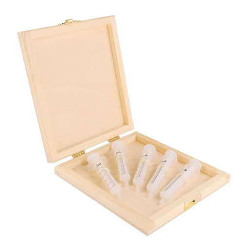 W zestawie pudełko oraz 5 strzykawek z gumeczkami.