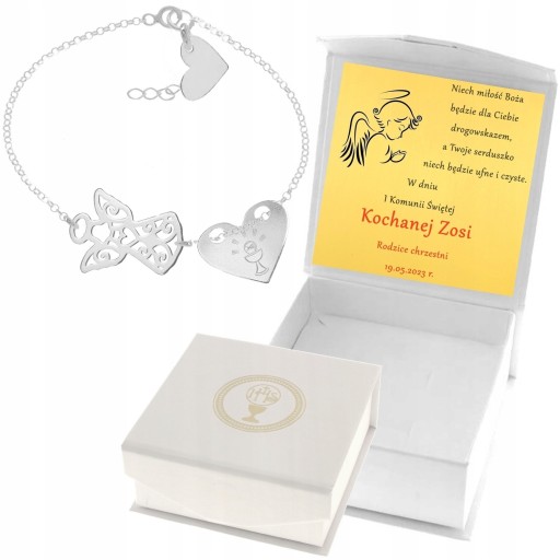 - blaszka w kształcie serca z grafiką kielicha IHS oraz możliwością spersonalizowanego graweru na odwrotnej stronie