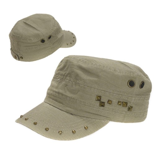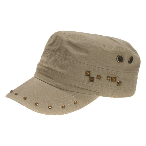 Daszek usztywniany ozdobiony ćwiekami, jak i również boki czapki wykończone ćwiekami.