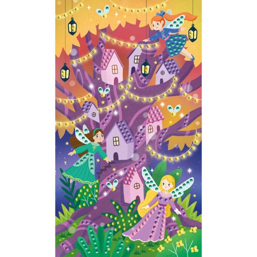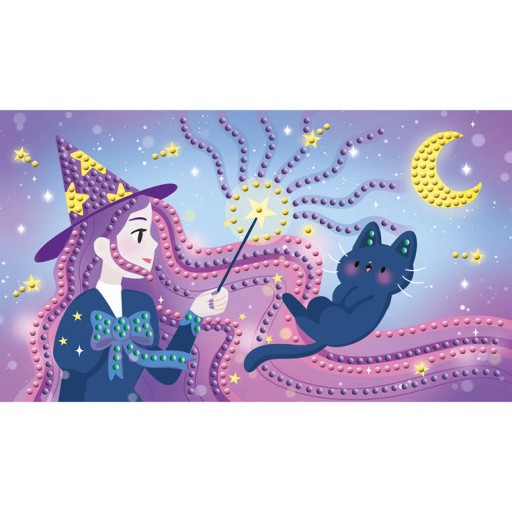 Zestaw kreatywny Diamenciki Magia francuskiej marki JANOD zawiera 3 plansze-obrazki z zachwycającymi magicznymi stworzeniami: jednorożcem na polanie, czarodziejką z kotem i drzewem z domkami leśnych wróżek.