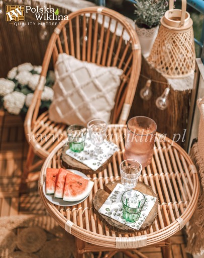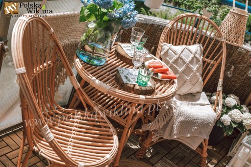 Komplet mebli wiklinowych fotele MUSZLA + stół okrągły wybijany to klasyka mebli wypoczynkowych. Można je postawić zarówno w domu, na tarasie, w ogrodzie, ale i na mniejszych lub większych balkonach. Na tym ostatnim sprawdzają się szczególnie dobrze, bowiem to właśnie mniejsze przestrzennie stanowią największy problem. Ten zestaw mebli wiklinowych jest rozwiązaniem na małe balkony czy tarasy. Fotele i stół z wikliny są nie tylko kompaktowe, wygodne i praktyczne, ale też eleganckie i stylowe.
