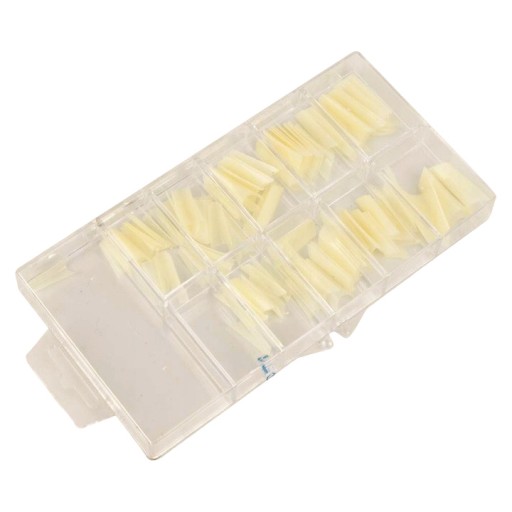 Opakowanie z przegródkami umożliwia uporządkowanie tipsów rozmiarami.