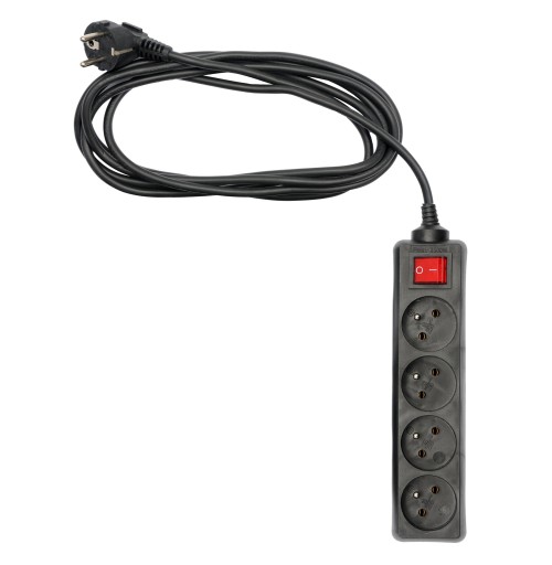 Klasyczny przedłużacz listwowy z 4 gniazdami z uziemieniem oraz włącznikiem do użytku domowego. Długość 5m. Obudowa gniazd z tworzywa sztucznego. Kolor czarny.