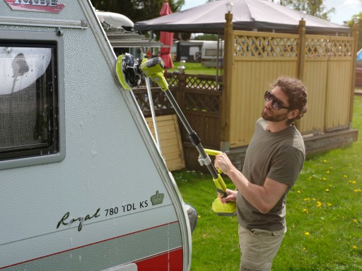 Obrotowa szczotka akumulatorowa Ryobi ONE+ R18TPS na wysięgniku to znakomite rozwiązanie do czyszczenia miejsc znajdujących się poza zasięgiem rąk. Obracająca się z prędkością 210obr./min szczotka o średnicy 15cm skutecznie usuwa nawet uporczywe zabrudzenia znajdujące się na elewacji, blachodachówce czy ścianie garażu.