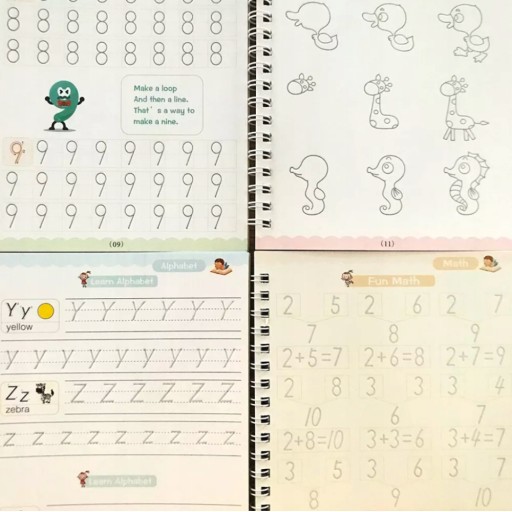 Zestaw książeczek rozwijających pisanie, naukę cyfr, liczenie i rysowanie z długopisem w zestawie to idealna propozycja dla dzieci w wieku przedszkolnym oraz wczesnoszkolnym, które chcą rozwijać swoje umiejętności manualne oraz poznawać podstawy edukacji matematycznej oraz językowej.