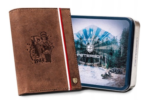 Męski portfel skórzany patriotyczny POWSTANIE WARSZAWSKIE 1944. Odszyty bardzo trwale z doskonałej jakości skóry naturalnej nubukowej. Portfel o klasycznej stylistyce. Model w orientacji pionowej zapinany w całości na zamek. Wyposażony w technologię RFID BLOCKING SYSTEM, która zabezpiecza karty zbliżeniowe
