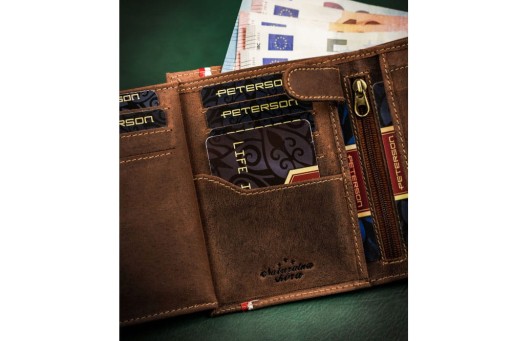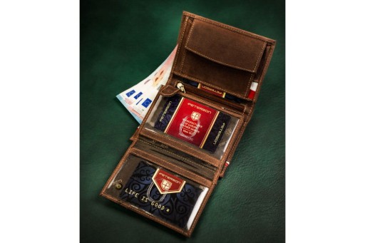 Portfel wyposażony w specjalną podszewkę z RFID BLOCKING SYSTEM (Radio-Frequency IDentification), która zabezpiecza karty zbliżeniowe, dokumenty biometryczne, legitymacje i karty komunikacji miejskiej przed nieautoryzowanym odczytem danych. Technologia uniemożliwia odczyt danych za pomocą specjalnych czytników wykorzystywanych do kradzieży danych.