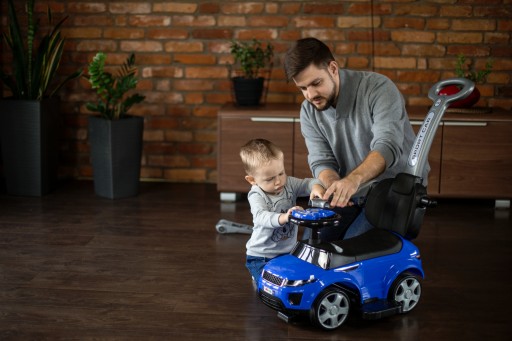 Jeździk - autko dla dzieci od 1-go roku. Rośnie wraz z dzieckiem: wraz z wiekiem dziecka demontujemy pchacz, poręcz zabezpieczającą, podnóżek. Pojazd jest z dźwiękiem i światełkami.