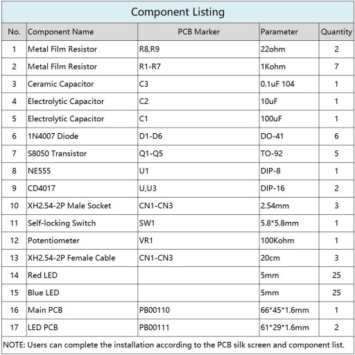 Układy mają nadrukowany schemat montażu na płytce. Trzeba zwrócić uwagę na biegunowość w przypadku takich elementów jak kondensatory, diody, tranzystory. W przypadku diód Led dłuższa nóżka to plus +, większość elementów ma opisane parametry na obudowie. Rezystory mogą mieć oznaczenia paskowe ich oporność oraz tolerancję można odczytać za pomocą kalkulatorów dostępnych w internecie lub mierząc miernikiem. Kolejność montażu zazwyczaj jest dowolna , w zależności od układu, montujemy najpierw najmniejsze element.
