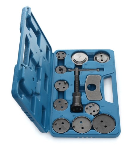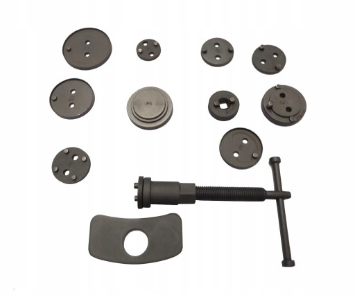 Opis produktu: Profesjonalny zestaw do cofania - wyciskania tłoczków w cylinderkach układów hamulcowych, niezbędny przy naprawach pojazdów wyposażonych w hamulce tarczowe. Zestaw posiada pokrętło wyposażone są w magnetyczne końcówki, dzięki czemu utrzymują talerzyk odpowiadający danemu tłoczkowi w osi. Zestaw pasuje do większości aut na rynku.