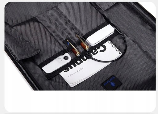 Plecak Arctic Hunter B00487 wykonano z wytrzymałego, impregnowanego materiału, dzięki czemu jest trwały i wodoodporny. Dodatkowe zabezpieczenie dla przenoszonych rzeczy stanowi przód plecaka, który został wykonany z twardego materiału EVA. Plecak posiada jedną komorę, która otwiera się pod kątem 90 stopni i jest zabezpieczona antykradzieżowym zamkiem TSA Lock. Wewnątrz znajduje się dedykowana, miękka kieszeń na laptop w rozmiarze do 15,6" oraz druga mniejsza kieszeń na tablet - obie zabezpieczone są elastyczną taśmą zapinaną na rzep. Po drugiej stronie komory znajdują się kieszonki na akcesoria i organizer na długopisy, oraz przestrzeń na zapakowanie rzeczy i ubrań. Zamek głównej komory jest dodatkowo zabezpieczony przed przemakaniem. Z tyłu plecaka umieszczono bezpieczną kieszeń na portfel lub telefon oraz nylonowy pas, dzięki któremu można założyć plecak na rączkę torby lotniczej. Szelki i plecy plecaka wyłożone są gąbkami zwiększającymi komfort w trakcie noszenia, a na jednej z szelek znajduje się zaczep na okulary. Plecak mamożliwość powiększenia poprzez rozpięcie dodatkowego zamka, dzięki czemu jego pojemność wzrasta. Plecak jest wyposażony w zewnętrzne złącze USB, dzięki czemu nie ma konieczności wyciągania power banka z plecaka, aby naładować telefon lub inne przenośne urządzenie. Złącze to jest ogumowane i zamykane na klapkę, dzięki czemu jest chronione przed zamoknięciem.