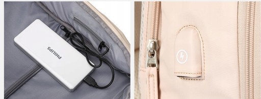 Plecak wyposażony jest w gniazdo USB, dzięki czemu nie ma konieczności wyciągania power banka z plecaka, aby naładować telefon. Uwaga, power bank nie jest częścią zestawu.