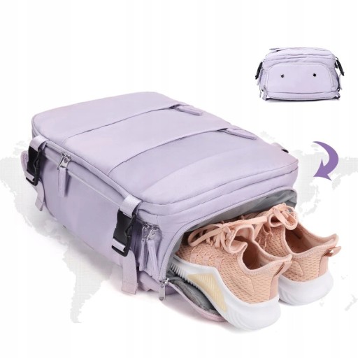 Spód plecaka wyposażony jest w wentylowaną kieszeń na buty. Dzięki niej, nie ma konieczności pakowania ich w osobne opakowania, z obawy o zabrudzenie ubrań znajdujących się w plecaku.