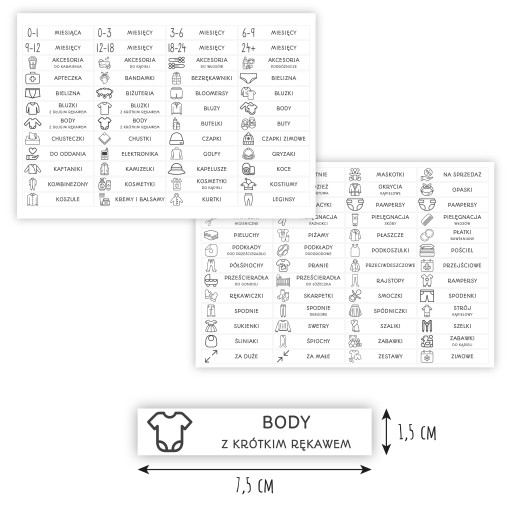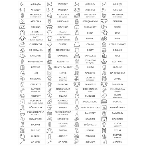 Dzięki naklejkom organizacyjnym łatwiej będzie Ci odróżnić ubrania za duże i za małe, zimowe i letnie, a także te, które chcesz sprzedać lub przekazać dalej. Na naklejkach znajdują się również oznaczenia tekstyliów dziecięcych, takie jak pościel, kocyki i prześcieradła.