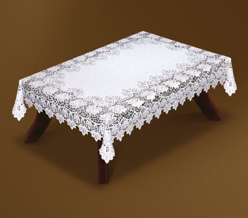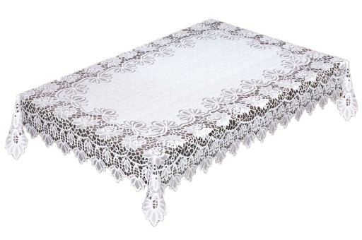 Obrus w kolorze białym ,bogaty wzór pięknie podkreśla kształt stołu.