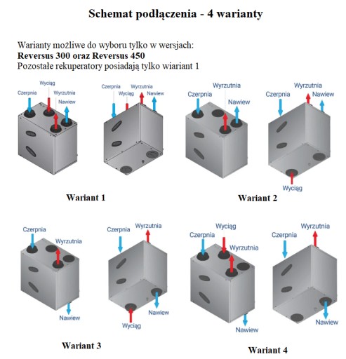 Cztery warianty podłączeń króćców, dają możliwość dopasowania do praktycznie każdej instalacji mechanicznej. Możliwe rozmieszczenia znajdują się poniżej. Dotyczy wersji: Reversus 300 oraz Reversus 450