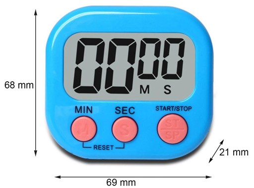 Minutnik JS-118 z dużym, czytelnym wyświetlaczem LCD. Minuty (21 mm) sekundy (16 mm). Maksymalny pomiar czasu to 99' 59". Wykorzystywany zarówno w gospodarstwach domowych jak i w firmach, szpitalach itp. Można go przypiąć, postawić, powiesić w różnych miejscach.