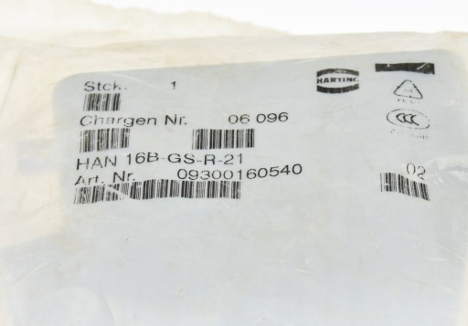 Nie używany, całkowicie sprawny element o symbolu: HAN 16B-GS-R-21, produkt firmy HARTING. Art. Nr. 09300160540. Obudowa wtyczki, pochodzą z likwidacji zapasów magazynu utrzymania ruchu. W oryginalnym opakowaniu.