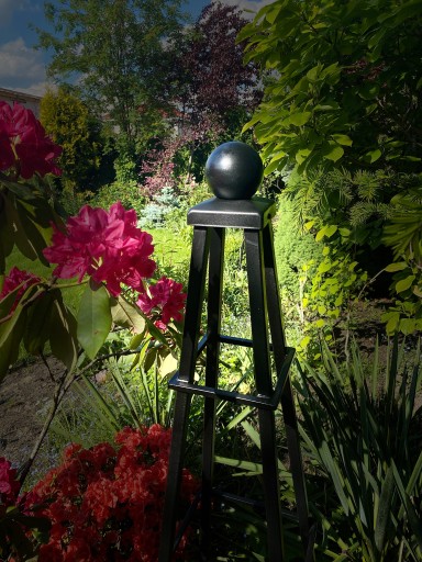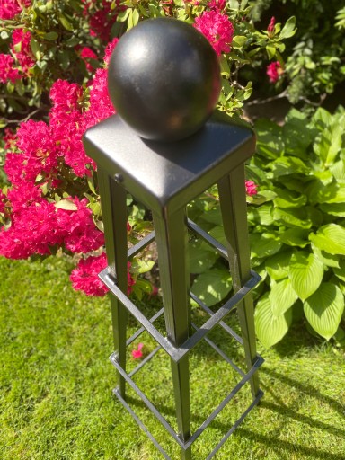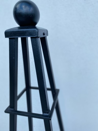 Nowoczesna konstrukcja w kształcie obelisku, zakończona stalową kulą, doda elegancji Twojemu ogrodowi .