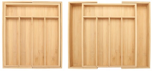 Wykonany z drewna bambusowego odpornego na wilgoć i odkształcenia, posiada osiem przegródek różnej długości oraz regulowaną szerokość.