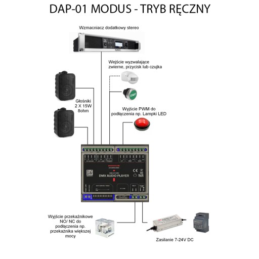 – tryb MANUAL w którym pliki audio są odtwarzane po aktywacji/zwarciu wejścia TRIGGER np. zewnętrznym przyciskiem lub czujką ruchu. Można zaprogramować wymaganą głośność, stan przekaźnika i sposób odtwarzania.