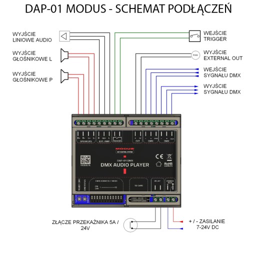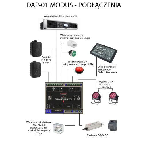 Wbudowany przekaźnik rozszerza możliwości sterownika umożliwiając załączanie \ wyłączanie urządzeń zewnętrznych o maksymalnym obciążeniu 5A i napięciu 24V, synchronicznie z odtwarzanym plikiem audio lub niezależnie za pomocą sygnału DMX.