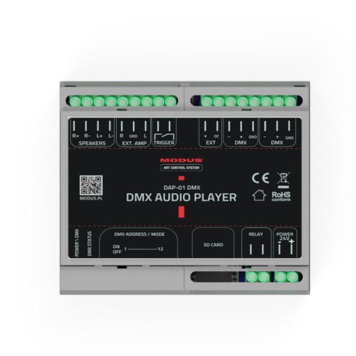 MODUS DMX Audio Player służy do odtwarzania utworów muzycznych, komunikatów głosowych, efektów dźwiękowych itp. w formacie MP3 oraz WAV.
