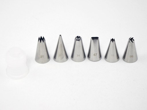 - W zestawie znajduje sześć różnych końcówek do dekorowania ze stali nierdzewnej oraz dwuczęściowy adapter z tworzywa.