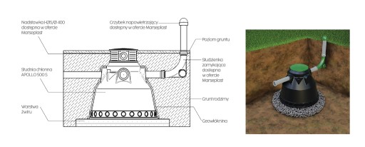 - Maksymalna głębokość zakopania studni chłonnych, liczona od dna studni: 1,35m dla studni Apollo 500S oraz 1,65m dla studni Apollo 1000S.