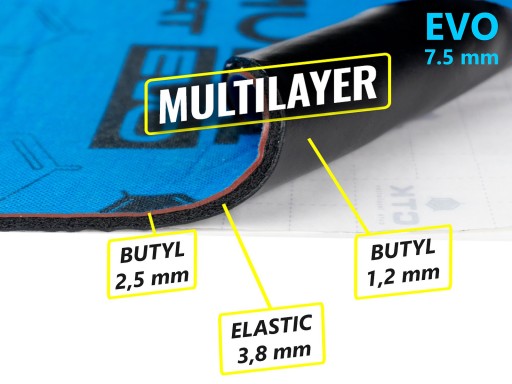 Multimat EVO to wysokiej jakości wielowarstwowy materiał wygłuszający klasy premium, który łączy w sobie właściwości tłumiące, dźwiękochłonne i izolujące. Składa się z warstwy innowacyjnej membrany akustycznej na bazie zagęszczonego butylu (2,5 mm), dźwiękochłonnej warstwy izolacji akustycznej i termicznej ze spienionego kauczuku Elastic (3,8 mm) oraz samoklejącej warstwy butylowo-polimerowej tłumiącej i pochłaniającej wibracje podłoża (1,2 mm). Materiał zapewnia wysoki poziom izolacji termicznej i akustycznej (do 35 dB w miejscu aplikacji), jest bardzo łatwy w montażu na płaskich powierzchniach oraz dobrze dopasowuje się do krztałtu na powierzchniach nieregularnych o łagodnych przetłoczeniach. Maty wielowarstwowe Multimat EVO są wodoodporne i mogą być stosowane także w miejscach, w których gromadzi się wilgoć. Szczególnie dobrze sprawdzają się jako główny materiał podczas wygłuszania podłogi, bagażnika i nadkoli samochodu lub jako druga warstwa naklejana na alu-butylowe maty tłumiące w miejscach o szczególnie silnym występowaniu hałasu. Maty Multimat EVO mogą być także stosowane podczas wygłuszania komór drzwiowych i podszybia zewnętrznego.