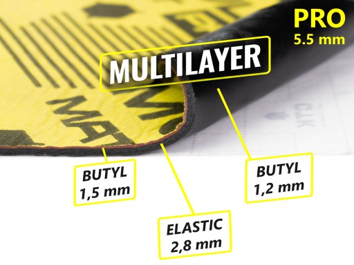 Multimat PRO to wysokiej jakości wielowarstwowy materiał wygłuszający, który łączy w sobie właściwości tłumiące, dźwiękochłonne i izolujące. Składa się z warstwy innowacyjnej membrany akustycznej na bazie zagęszczonego butylu (1,5 mm), dźwiękochłonnej warstwy izolacji akustycznej i termicznej ze spienionego kauczuku Elastic (2,8 mm) oraz samoklejącej warstwy butylowo-polimerowej tłumiącej i pochłaniającej wibracje podłoża (1,2 mm). Materiał zapewnia wysoki poziom izolacji termicznej i akustycznej (do 32 dB w miejscu aplikacji), jest bardzo łatwy w montażu na płaskich powierzchniach oraz dobrze dopasowuje się do krztałtu na powierzchniach nieregularnych o łagodnych przetłoczeniach. Maty wielowarstwowe Multimat PRO są wodoodporne i mogą być stosowane także w miejscach, w których gromadzi się wilgoć. Szczególnie dobrze sprawdzają się jako główny materiał podczas wygłuszania wnętrza komór drzwiowych i dachu lub jako druga warstwa naklejana na alu-butylowe maty tłumiące w pozostałych miejscach nadwozia (podłoga, bagażnik i inne).